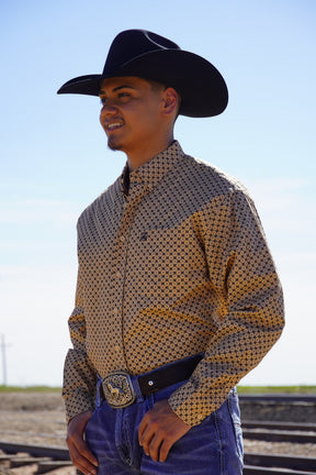 This rustic brown shirt features a geometric print that will capture your eye.  100% cotton and with a classic fit, this long sleeve button up will become one of your favorites!