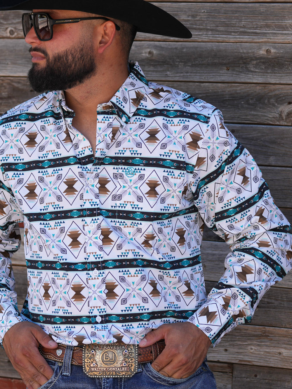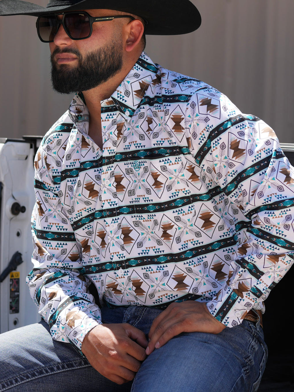 Turn heads in true western style with this CueroLine Aztec Stripe Button-Up. Featuring a bold brown Aztec stripe design, this shirt blends classic cowboy character with modern detail. Crafted from 100% cotton, it offers breathable comfort and durability for everyday wear. Designed with a western fit, button-down front, and finished with the signature CueroLine logo, it’s the perfect balance of rugged and refined.