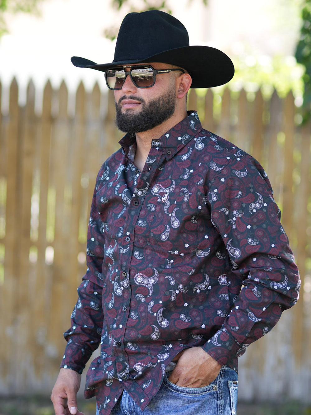 Make a statement with this CueroLine Black & Burgundy Paisley Button-Up — a perfect blend of bold western tradition and modern edge. Featuring an intricate burgundy paisley pattern set against a sleek black background, this shirt delivers standout style for any occasion. Crafted from 100% cotton, it provides breathable comfort and a reliable western fit. Finished with button-down detailing and the signature CueroLine logo, it’s made for the cowboy who values both style and substance.