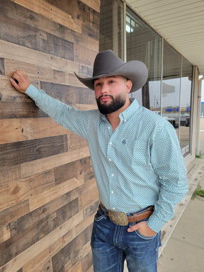 Fancy green diamond print to get you ready for this summer. Crafted from 100% cotton, this classic fit, long sleeve button up gives exudes summery western vibes. **PLEASE SIZE DOWN, THIS SHIRT COMES ROOMY!! PORFAVOR COMPRE 1 MEDIDA MAS CHICA EN ESTE ESTILO YA QUE VIENE AMPLIA!!**